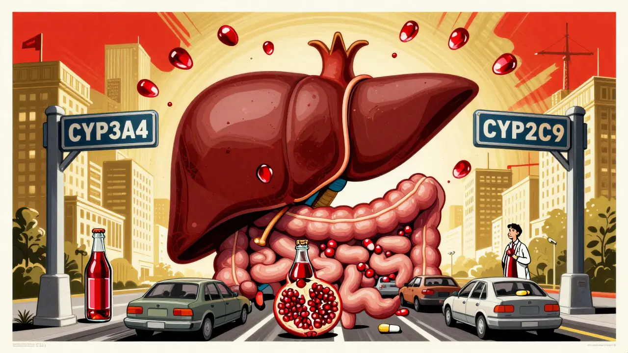 Pomegranate juice contains compounds like punicalagins and ellagitannins. These aren’t just antioxidants-they’re also enzyme inhibitors. In lab tests, they’ve been shown to block CYP3A4 and CYP2C9. When that happens, your body can’t break down the drug as quickly. That means more of the drug stays in your bloodstream. For some medications, that’s harmless. For others? It can be dangerous.